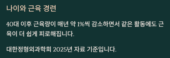 40대 이후에는 근육량이 매년 약 1%씩 감소한다고 해요. 그래서 같은 활동을 해도 근육이 더 쉽게 피로해지죠.